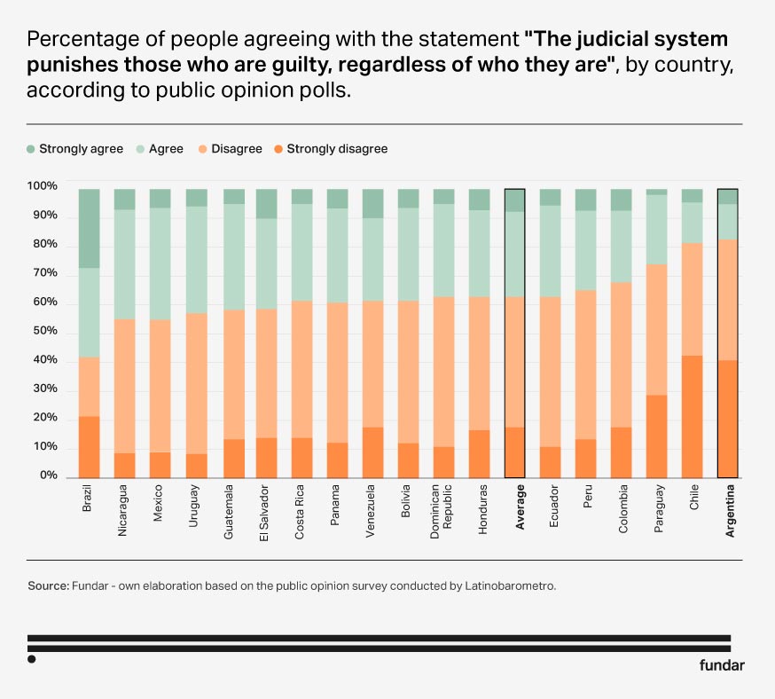Low public confidence in the Argentine judiciary is a long-standing and persistent problem. Over 82% of respondents disagreed with the statement that the judicial system punishes those who are guilty, which reflects they believe that justice is not administered impartially and fairly in Argentina.