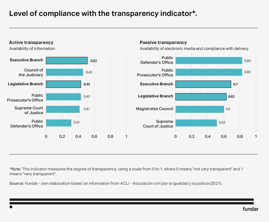 A close look at the performance of judicial institutions in terms of transparency reveals that prosecutors and public defenders achieved the highest scores, outperforming the Executive and Legislative Branches. On the other hand, the Supreme Court and the Judicial Council have the lowest scores.