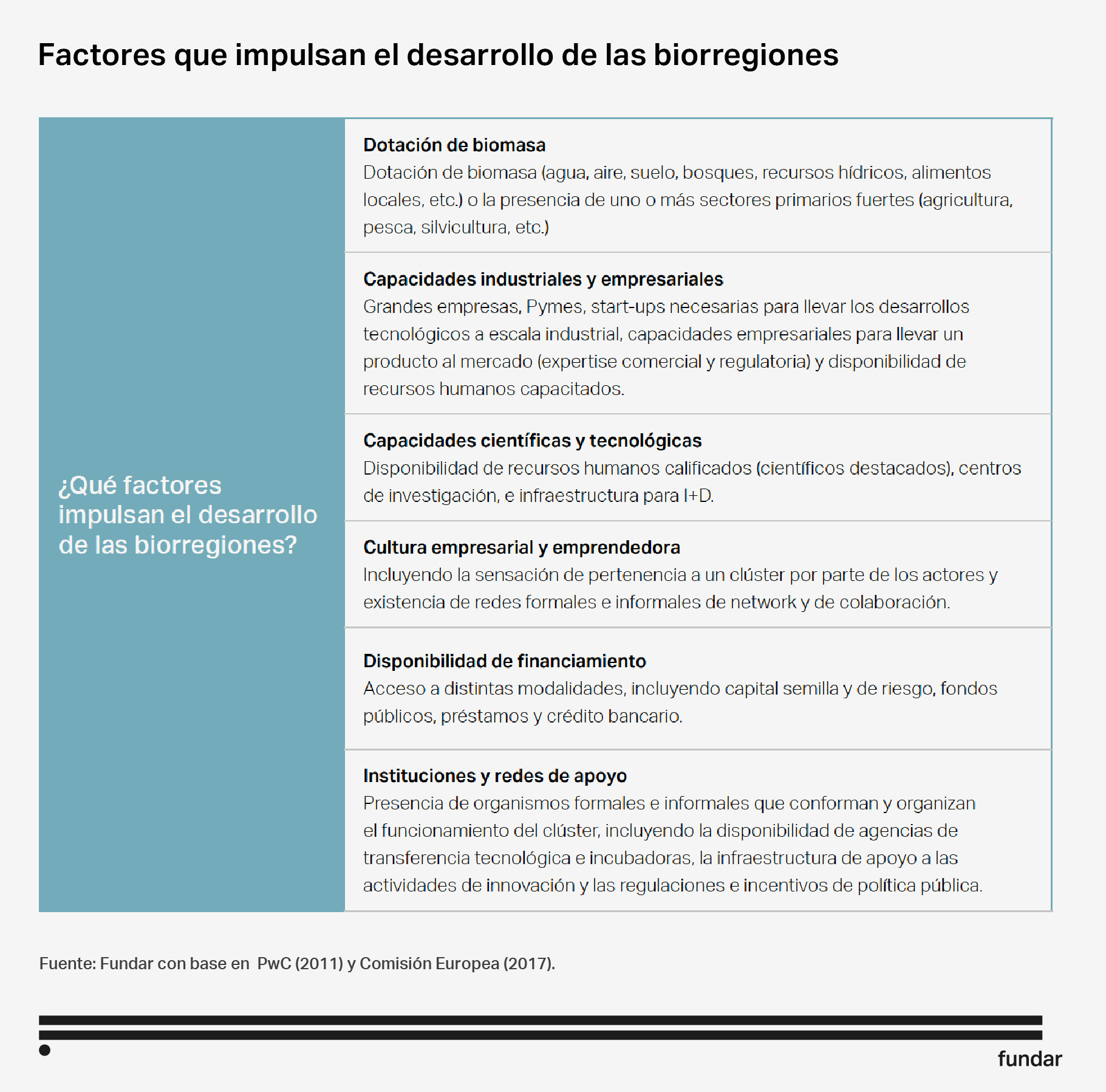 En años recientes el debate sobre los instrumentos más adecuados para promover la bioeconomía giró del ámbito nacional al subnacional, y a la implementación de políticas de promoción de biorregiones. El desarrollo de bioclusters (o biorregiones) propone dividir geográficamente el territorio en función de su potencialidad bioeconómica. Permite adoptar una perspectiva territorial que cruce la oferta de biomasa de cada entorno espacial (microfauna, suelos, climas y variedades genéticas) con la disponibilidad de capacidades que hacen posible su aprovechamiento.