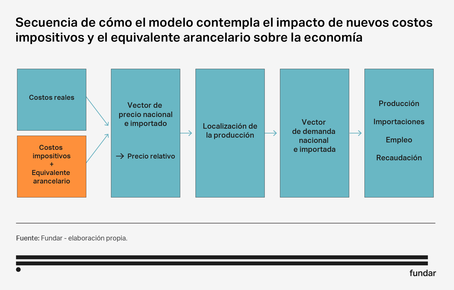 Se generó un modelo de simulación de lo que sucedería al finalizar los 11 años estipulados para la transformación. El modelo hace foco en los tres principales productos del subrégimen: celulares, televisores y equipos acondicionadores de aire; luego, extrapola los resultados al resto de los productos. Se focaliza en estos tres productos porque representan el 77% de las ventas al continente y el 82% del costo fiscal del subrégimen. Realiza simulaciones independientes para cada uno de los tres productos, basada en la siguiente secuencia de impactos esperados.