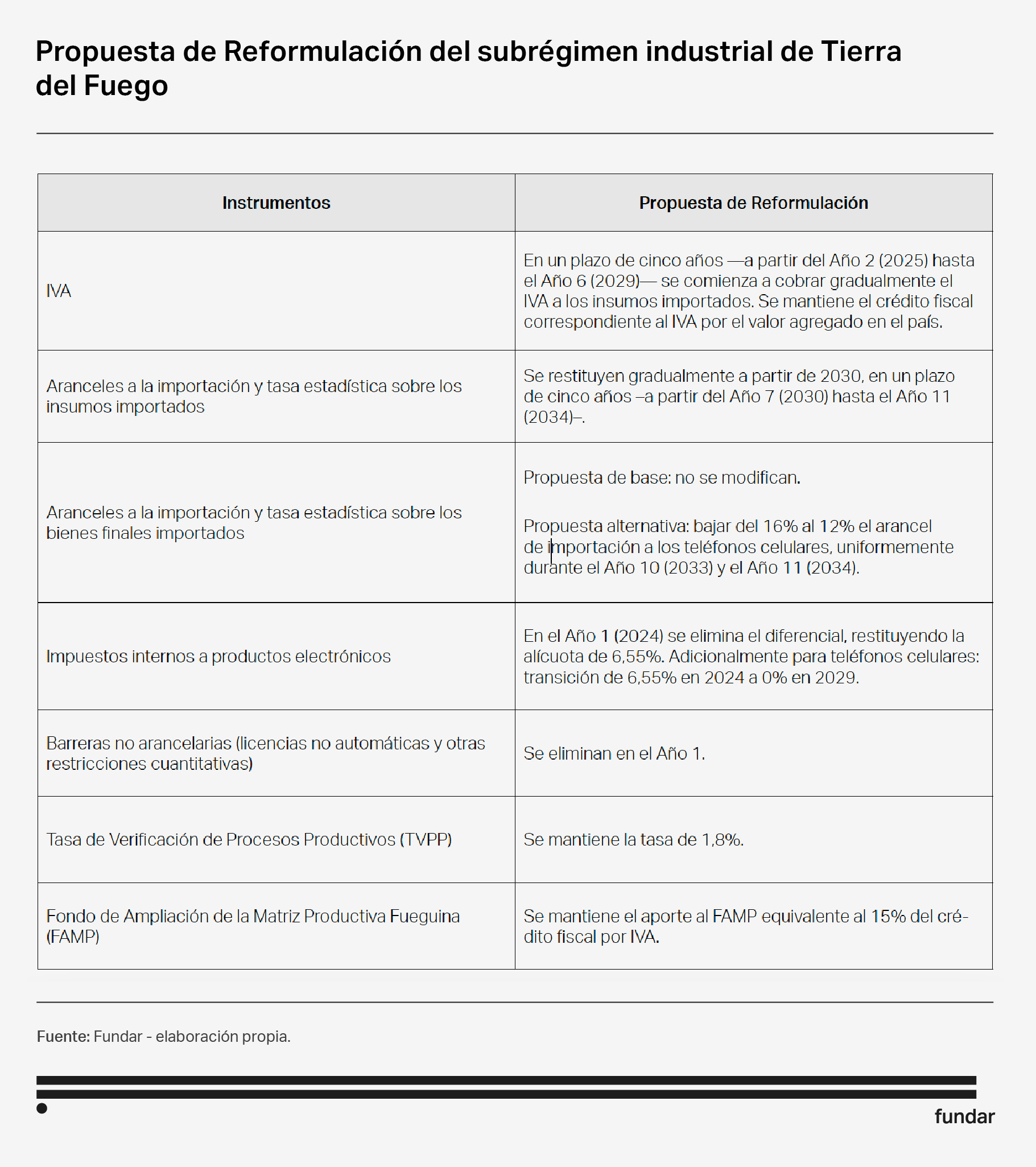 A grandes rasgos, la propuesta contempla en forma inmediata la remoción de toda restricción no arancelaria y la eliminación de la brecha de impuestos internos entre los productos electrónicos nacionales e importados, situando la alícuota común en 6,55% (salvo para los teléfonos celulares, donde se reduciría gradualmente a 0%). Luego, entre los Años 2 y 6 la importación de insumos pasaría gradualmente a pagar IVA, mientras que entre los Años 7 y 11 la misma pasaría a pagar los correspondientes aranceles de importación. De esta manera, el valor agregado en Argentina continuaría sin pagar IVA y se beneficiaría también de la protección efectiva que otorga el escalonamiento arancelario.