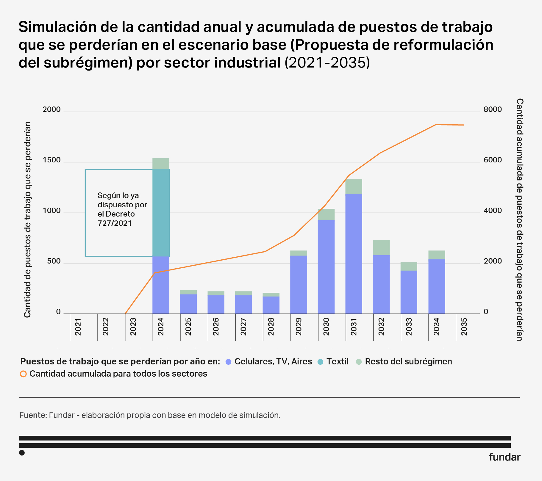 Respecto del empleo, se destaca un impacto negativo inicial, en parte debido a la normativa vigente que estipuló la exclusión del sector textil de la renovación del subrégimen industrial, y porque, desde el momento inicial de la propuesta, operan dos medidas de alto impacto (la quita de barreras no arancelarias y la eliminación del diferencial de impuestos internos). Durante los años siguientes los impactos son heterogéneos. En un primer período (2025-2028), serían más suaves; y luego (de 2029 a 2034), aumentaría por la relocalización productiva de celulares y aires acondicionados hacia el exterior del país como respuesta al cambio en los costos relativos entre producir localmente e importar.