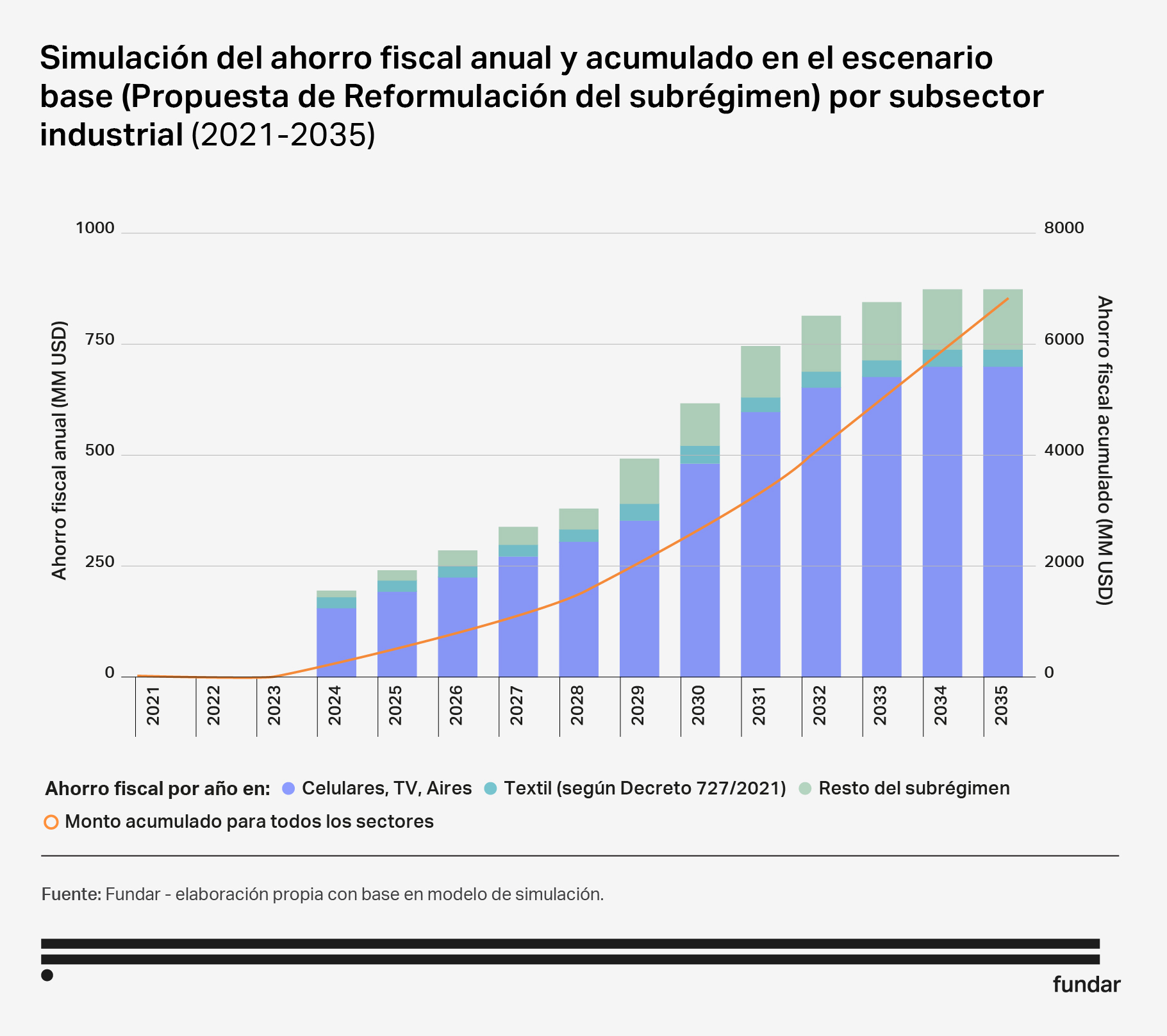La reformulación generaría, asimismo, un significativo ahorro fiscal. Tanto por la sustitución gradual de producción nacional, que no paga impuestos, por importaciones, que sí lo hacen, como por los impuestos a los insumos importados que comenzaría a pagar la actividad de la isla, el ahorro fiscal crecería año a año desde el inicio hasta el final de la implementación de la propuesta, llegando en 2034 a USD 881 millones (un 82,4% del costo fiscal actual del subrégimen, tal como fue estimado en el Documento 1 de esta serie).