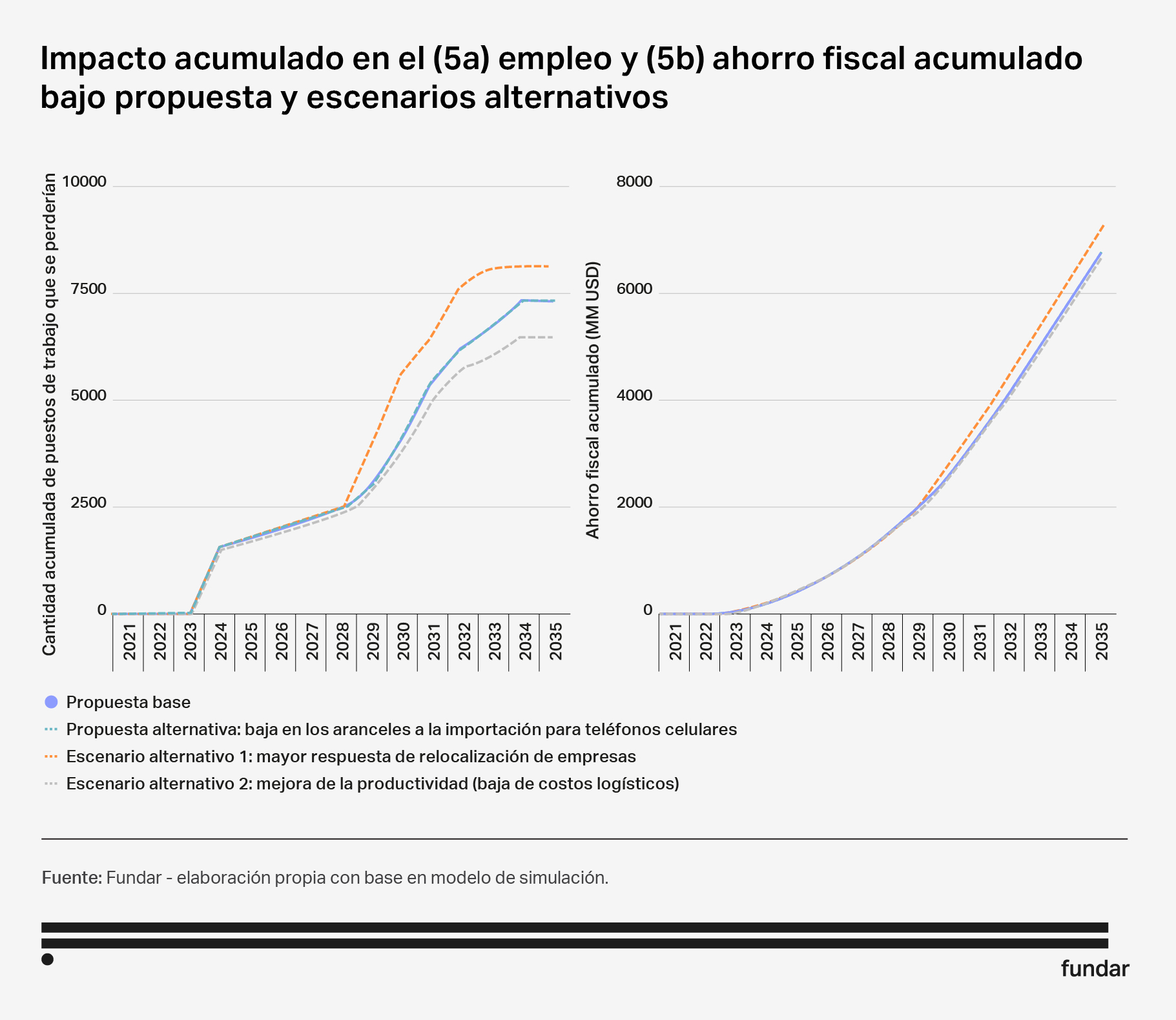Las cifras hasta aquí presentadas hacen una comparación “punta a punta” entre el primer y el último año. Sin embargo, la propuesta establece un cronograma de implementación gradual. Por ello, interesa también considerar el impacto en el tiempo poniendo el foco en la evolución proyectada de las principales variables sociales y económicas: el empleo y el ahorro fiscal.